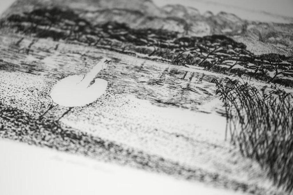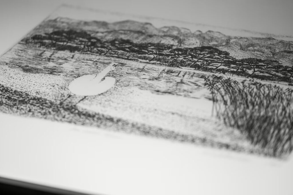 Druck der Radierung „Am alten Rhein“ aus der Mappe ‚Ems‘ von Dr. Gottlieb Sutterlütti. Abgerundet wird der Kunstgenuss von einem feinen Pralinen Dreierlei der Confiserie Fenkart.