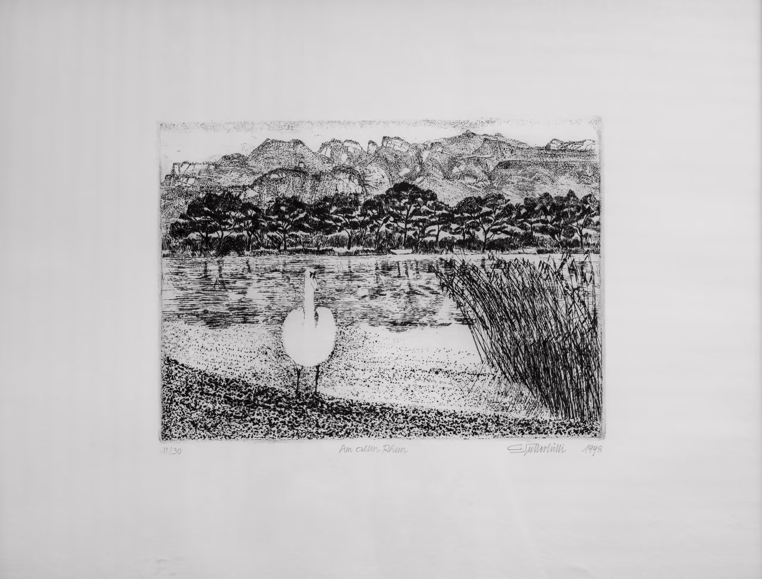 Druck der Radierung „Am alten Rhein“ aus der Mappe ‚Ems‘ von Dr. Gottlieb Sutterlütti. Abgerundet wird der Kunstgenuss von einem feinen Pralinen Dreierlei der Confiserie Fenkart.