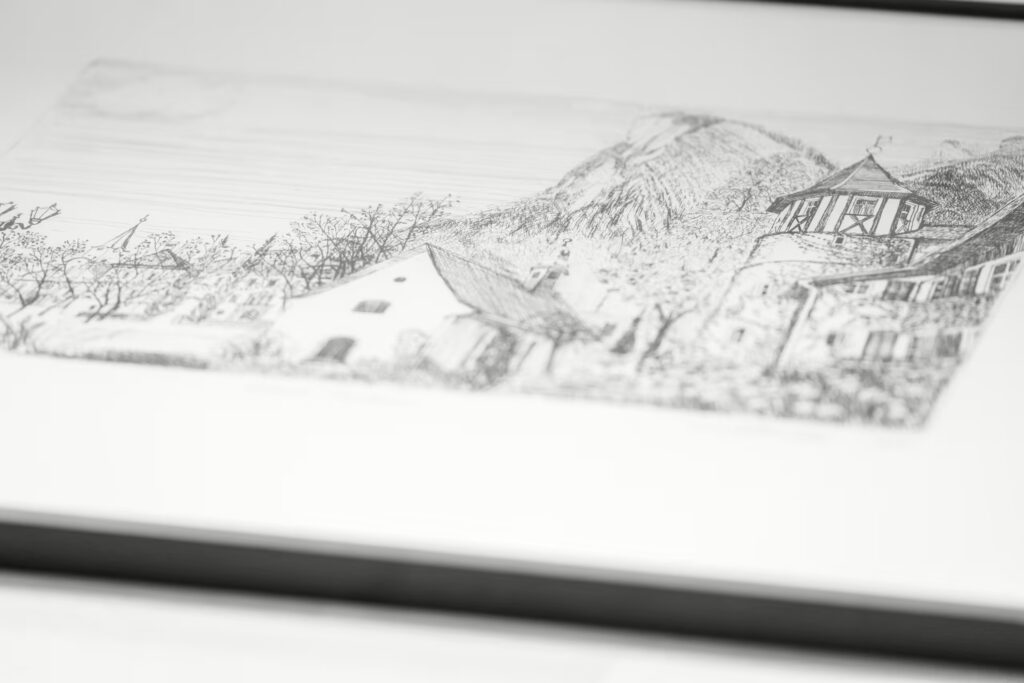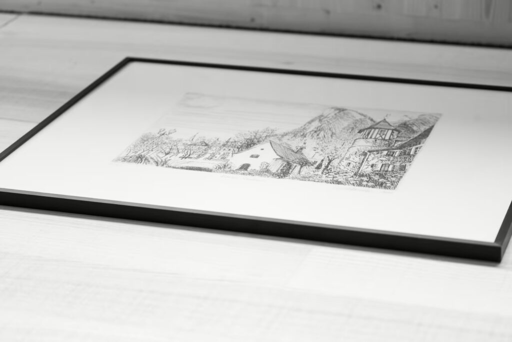 Druck der Radierung „Emser Rathaus“ aus der Mappe ‚Ems‘ von Dr. Gottlieb Sutterlütti. Abgerundet wird der Kunstgenuss von einem feinen Pralinen Dreierlei der Confiserie Fenkart.