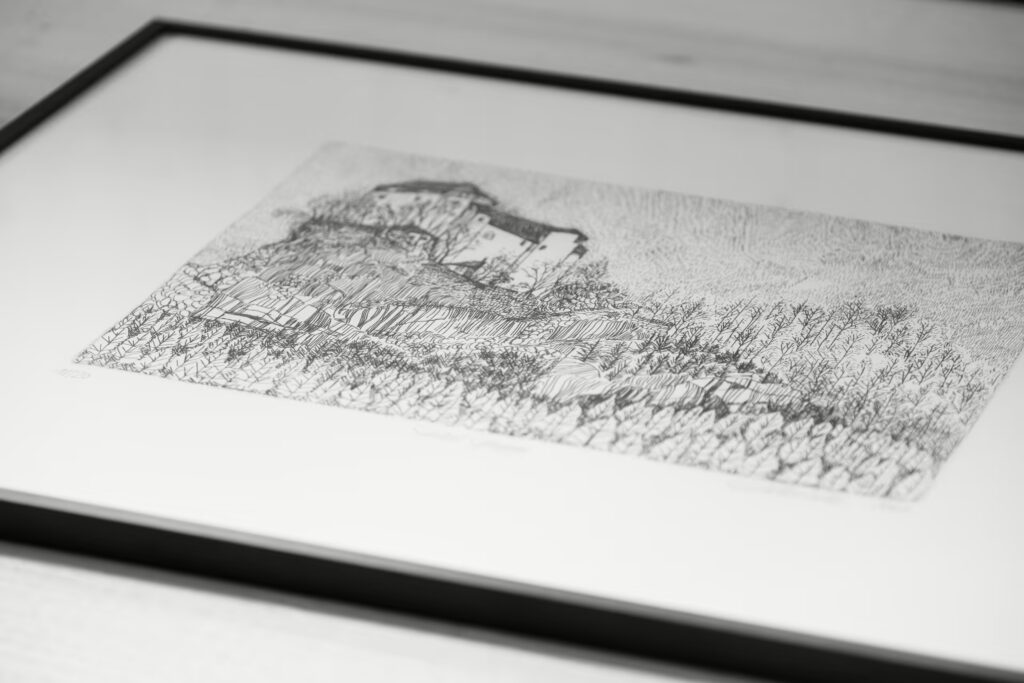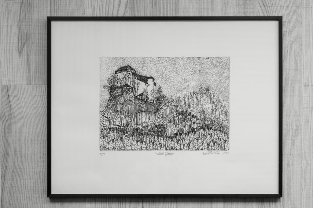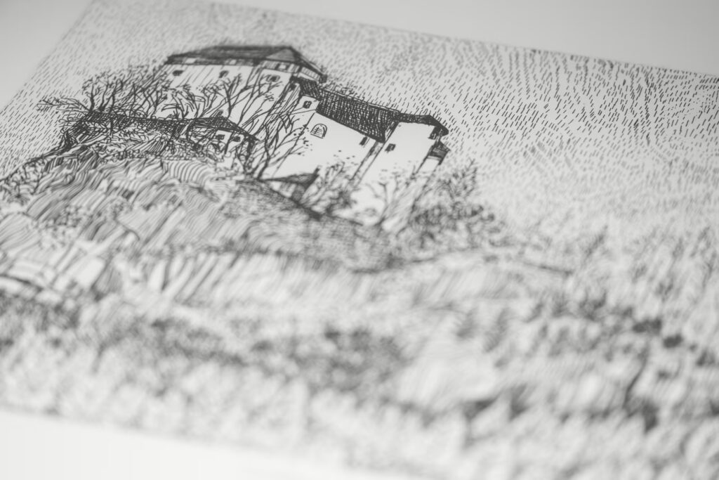 Druck der Radierung „Schloss Glopper“ aus der Mappe ‚Ems‘ von Dr. Gottlieb Sutterlütti. Abgerundet wird der Kunstgenuss von einem feinen Pralinen Dreierlei der Confiserie Fenkart.